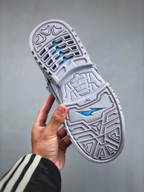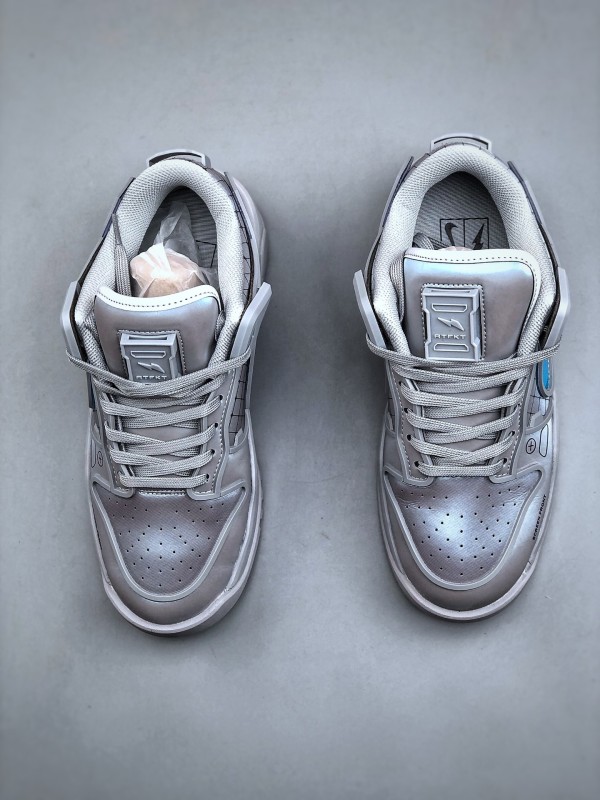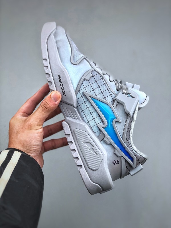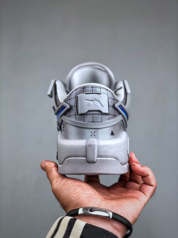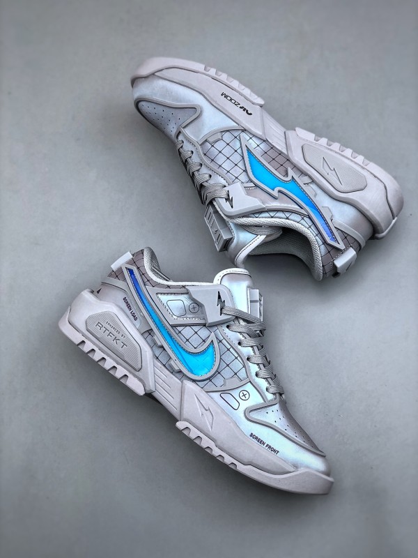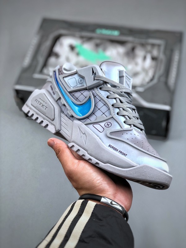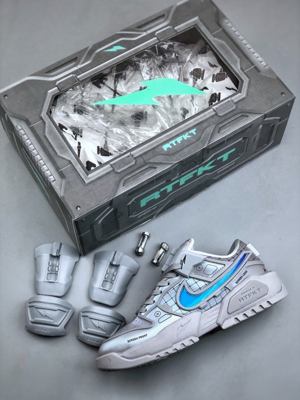 첫 번째 디자인은 연한 회색을 메인 톤으로, RTFKT의 시그니처인 SF(Science Fiction) 감성을 유지하며, 심플한 컬러 조합에도 시선을 사로잡습니다. 공식 디테일을 보면, 혀 부분의 슈 레이스 버클은 탈부착이 가능해 더욱 미니멀한 스타일을 연출할 수 있습니다. 특기할 점은 미드솔에 에어 줌 유닛을 장착하여 탁월한 착용감을 제공한다는 것입니다. 다른 디자인은 블랙과 퍼플 컬러로 구성되어, 이전 디자인보다 더 스타일리시하고 미래지향적인 느낌을 줍니다. 디테일 사진을 보면 갑피에 PVC 느낌의 가죽 소재를 사용한 것으로 보이며, 질감 표현은 걱정하지 않아도 됩니다.