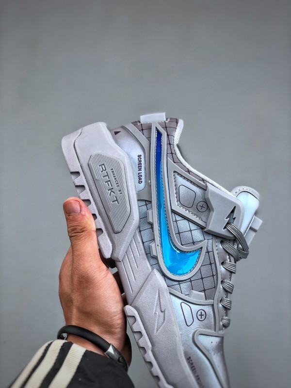 첫 번째 디자인은 연한 회색을 메인 톤으로, RTFKT의 시그니처인 SF(Science Fiction) 감성을 유지하며, 심플한 컬러 조합에도 시선을 사로잡습니다. 공식 디테일을 보면, 혀 부분의 슈 레이스 버클은 탈부착이 가능해 더욱 미니멀한 스타일을 연출할 수 있습니다. 특기할 점은 미드솔에 에어 줌 유닛을 장착하여 탁월한 착용감을 제공한다는 것입니다. 다른 디자인은 블랙과 퍼플 컬러로 구성되어, 이전 디자인보다 더 스타일리시하고 미래지향적인 느낌을 줍니다. 디테일 사진을 보면 갑피에 PVC 느낌의 가죽 소재를 사용한 것으로 보이며, 질감 표현은 걱정하지 않아도 됩니다.